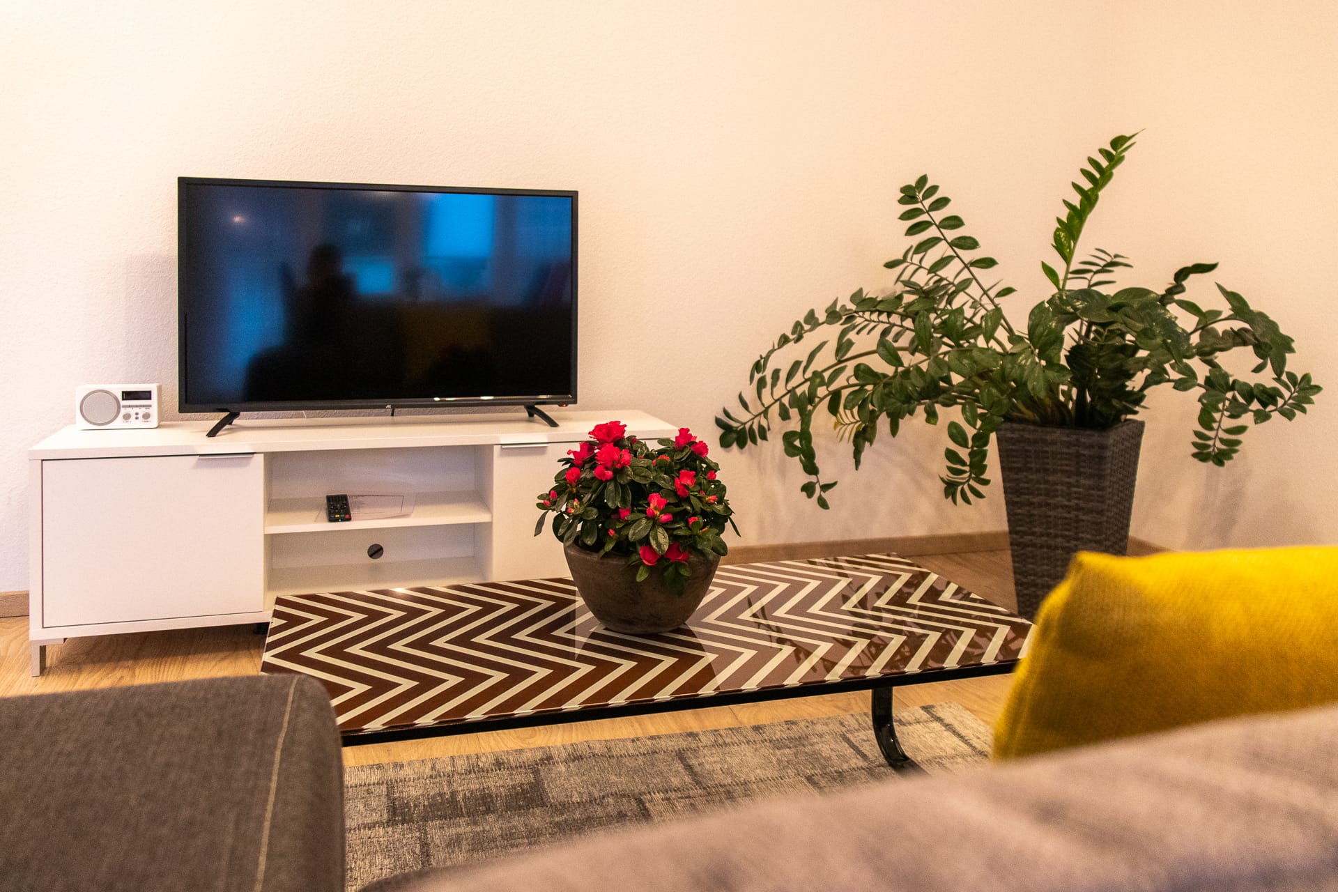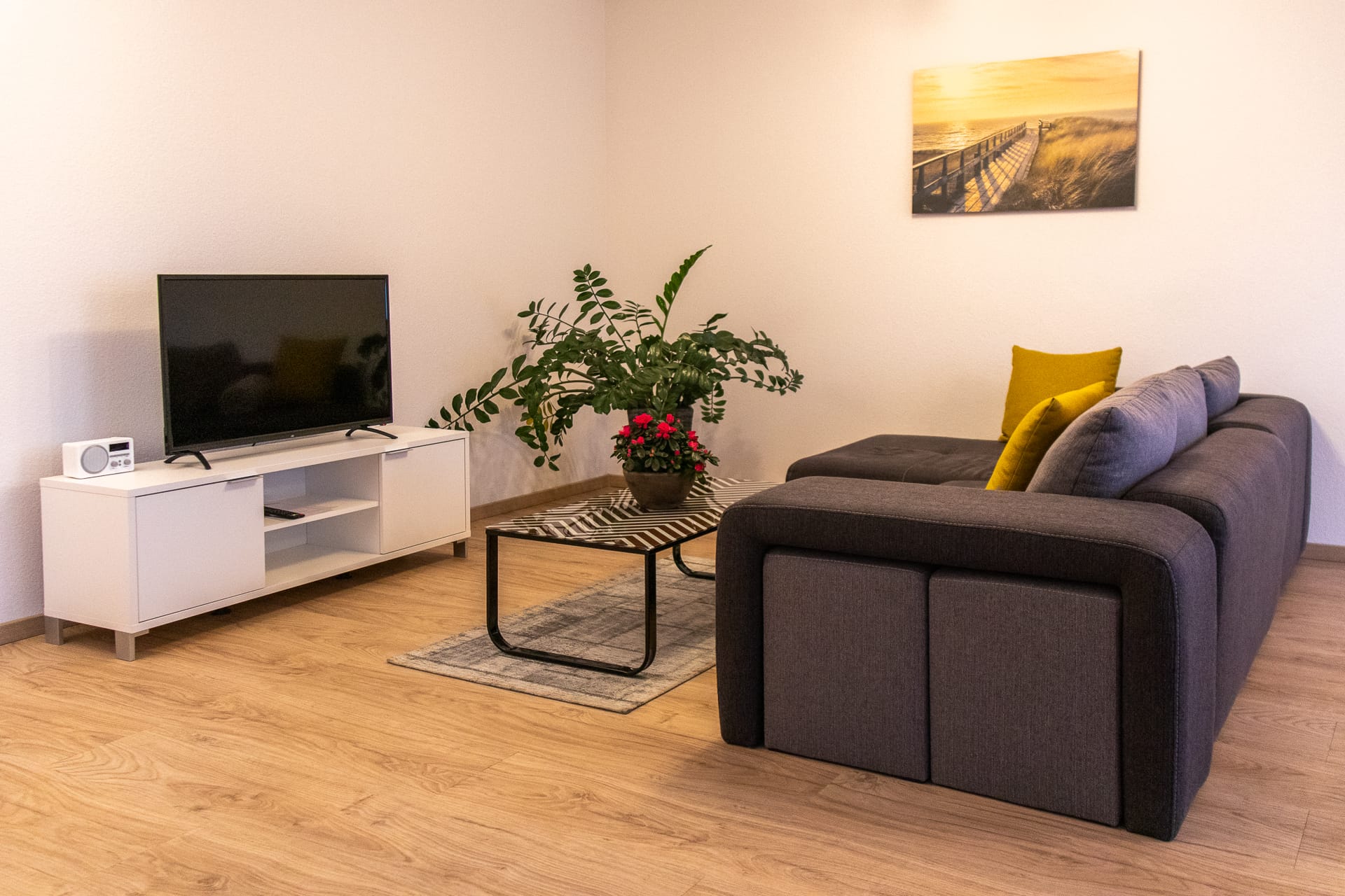 Esstisch, Lowboard, Sofa, TV SAT/Kabel