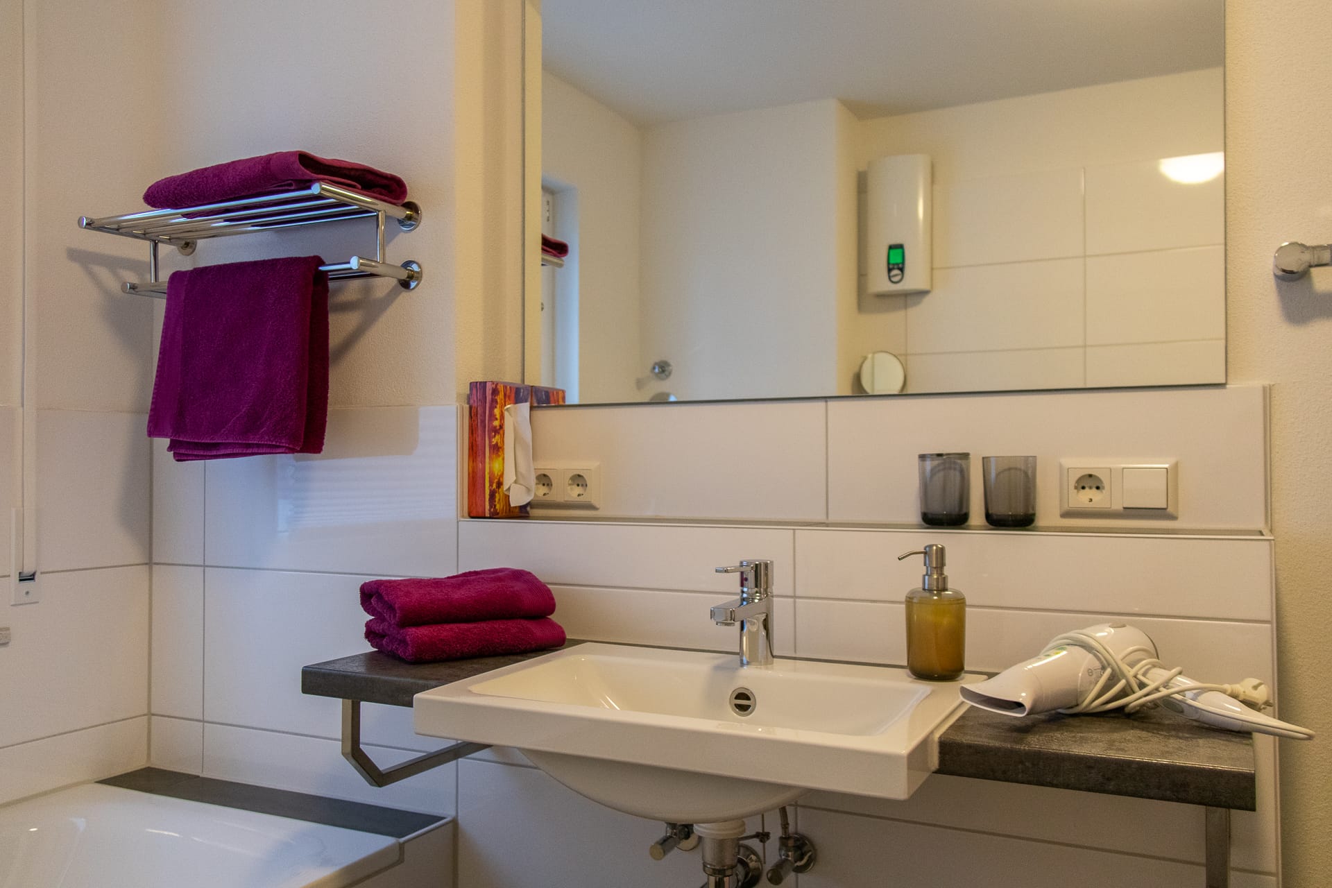Dusche, Föhn, Spiegel, Waschbecken, Handtücher