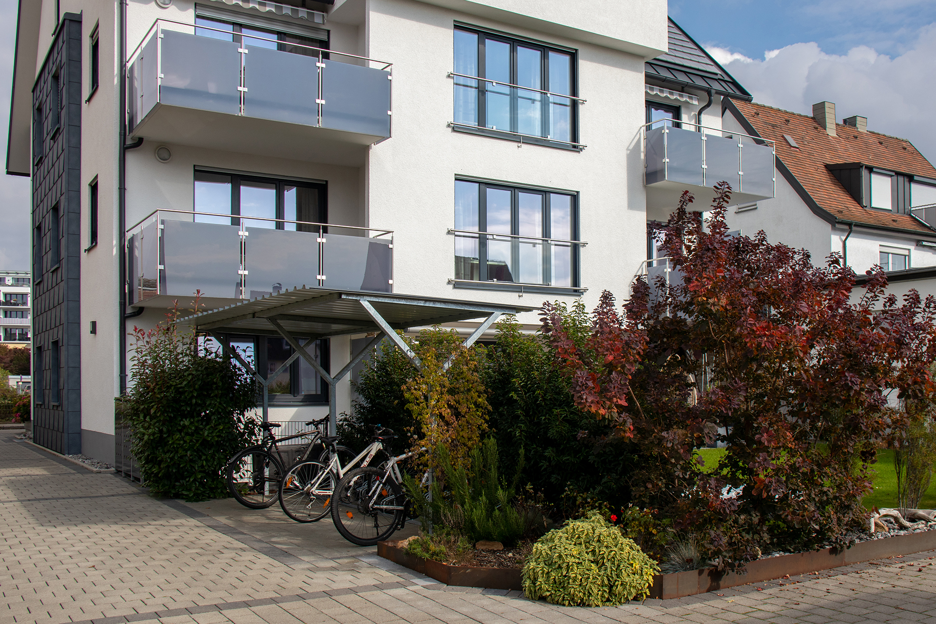 Es erwarten Sie sämtliche Annehmlichkeiten vom Aufzug über Fußbodenheizung bis hin zu hochwertigen Bädern. Die modern ausgestatteten Einbauküchen sowie alle Einrichtungsgegenstände bieten ein besonderes behagliches Ambiente mit hohem Wohnkomfort. WLAN und SAT-Fernsehen gehören zum hohen Standard der Wohnungen, ebenso die überdachten Stellplätze für Fahrräder und Autos hinter dem Haus.